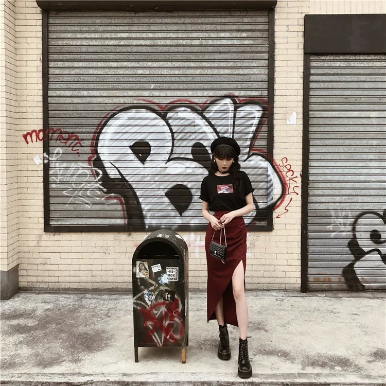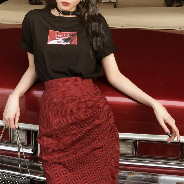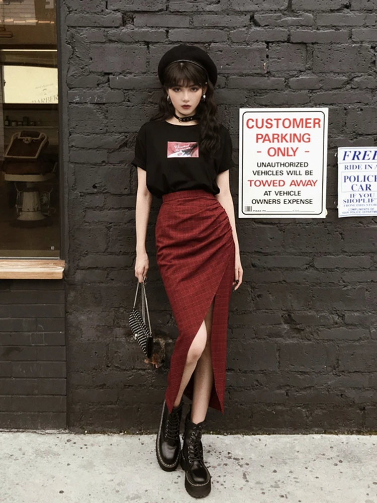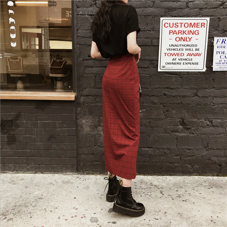 original dark hard girl cool and handsome Red Plaid split high waist long skirt shows thin autumn girl
